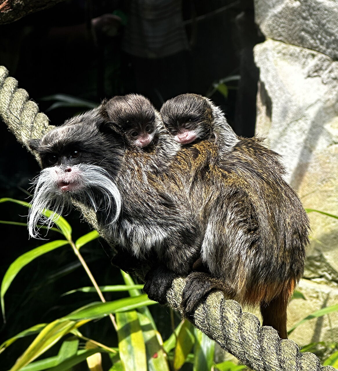 Kaiserschnurrbarttamarine (Sanguinus imperator) bekommen - wie auch andere Mitglieder der Familie der Krallenaffen - meistens Zwillinge. Für die Mutter ist es eine ziemlich schwierige Aufgabe, die Kleinen großzuziehen. Deshalb spielt der Vater bei der Aufzucht eine große Rolle. Nach der Geburt beißt er die Nabelschnur durch und leckt die Kleinen sauber. Auch trägt er die Kleinen auf seinem Rücken mit sich. Die Kleinen kommen nur zum Trinken zu ihren Müttern. Kaiserschnurrbarttamarine werden schon mit ungefähr 16 bis 20 Wochen erwachsen. Vater Cusco kam 2018 aus dem Zoo Neumünster in den Zoo am Meer, das Weibchen Bacuri 2022 aus dem französischen Zoo Zooparc Beaval.