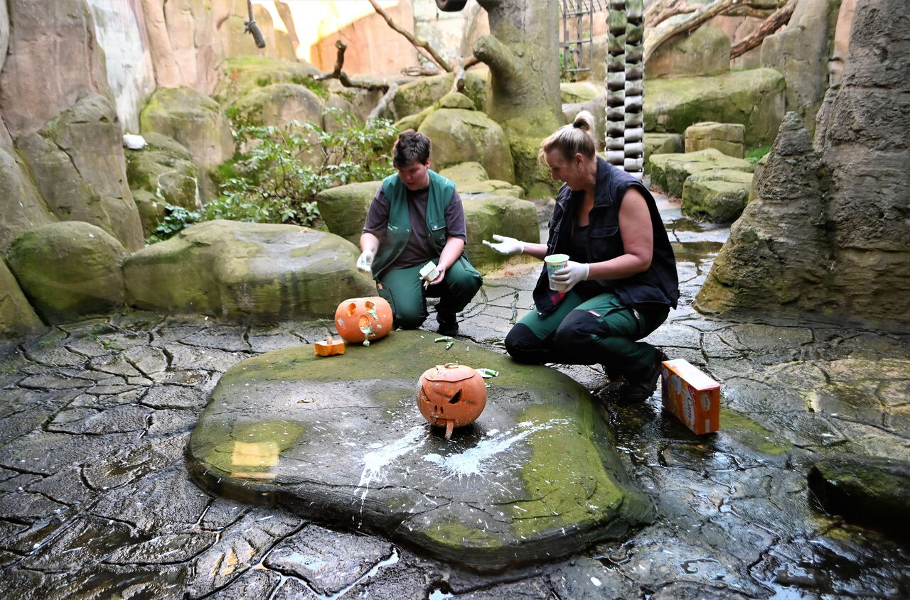 Was für die Besucher:innen „nur“ nach einem riesigen Spaß aussieht, ist für uns zudem ein wichtiger Teil der modernen Zootierpflege, nämlich die Beschäftigung der Tiere. In der Wildbahn nimmt die Nahrungssuche einen großen Teil der täglichen Zeit in Anspruch. Zootiere bekommen ihr tägliches Futter von den Pfleger:innen serviert, müssen aber auch dafür etwas tun, damit keine Langeweile aufkommt. Wie in der Wildbahn auch, gibt es immer neue Herausforderungen. Ein großer, furchterregender Kürbis kommt da gerade recht.
