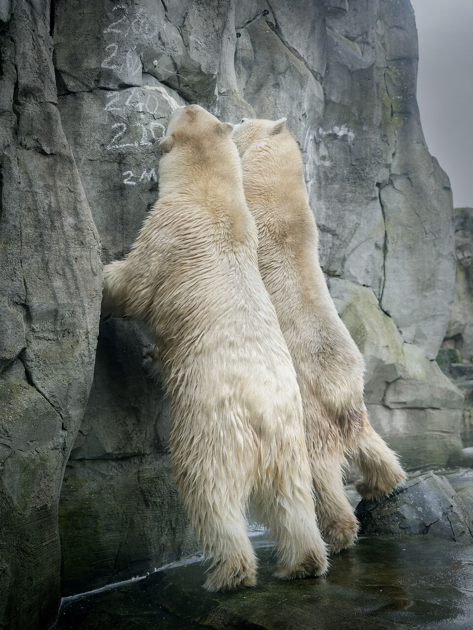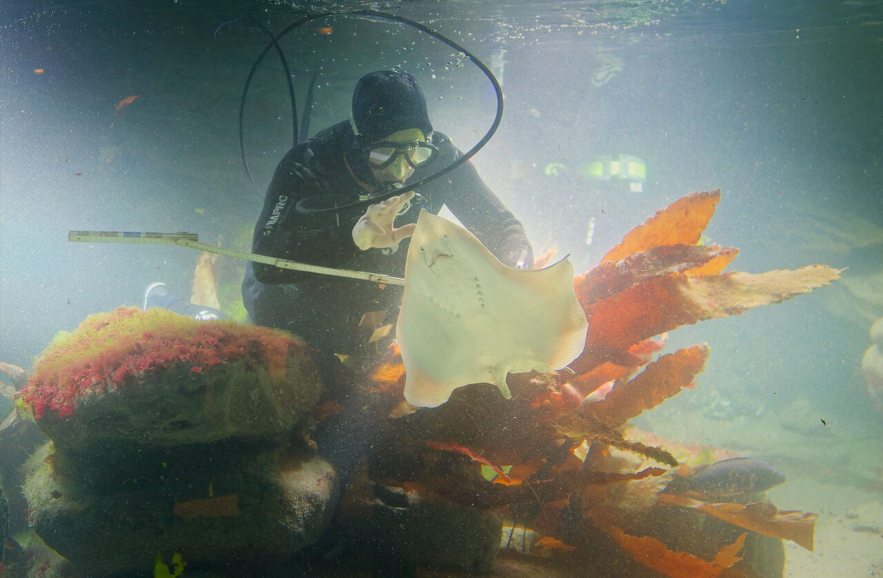 Das Wiegen und Messen der Tiere stellt immer eine besondere Herausforderung für die Pflegenden dar, denn sie sind darauf angewiesen, dass die Tiere sich freiwillig auf die Waage stellen oder sich aufrichten. Bei den besonders gefährlichen Wildtieren, wie den Eisbären, geht das nur von außen, mit Training und Leckerlis bzw. bei den Eisbären mit Mayonnaise. Die Seelöwen und Seebären sind trainiert und arbeiten ohne Distanz mit den Pflegenden. Bei den Pinguinen ist Vorsicht geboten, denn sie können kräftig mit dem Schnabel zwicken. Unser Nachwuchs und der Vater bei den Kaiserschnurrbarttamarinen ist schnell zu begeistern, das Weibchen Bacuri wiederum hatte heute keine Lust. Die Nagelrochen schienen sehr überrascht, dass sie vermessen werden sollten, aber am Ende gelang auch das. Die vermessenen Tiere sind alle wohlgenährt und gut im Wachstum.
