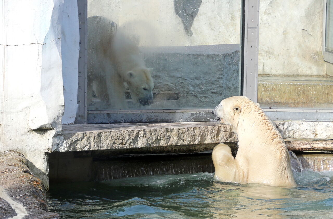 Am nächsten Morgen kam er um 9.00 Uhr bereits auf die Außenanlage, wo ein leckeres Gemüse Potpourri auf ihn wartete. Lloyd verschmähte den Salat, eigentlich einer seiner Lieblingsspeisen, und ließ sich erst einmal ins Wasser gleiten. Denn am Wasser, auf der anderen Seite der Scheibe, wartete schon Lloyds neue Gefährtin Charlotte auf den neuen Mitbewohner. Die erste Kontaktaufnahme zeigte große Neugierde auf beiden Seiten, verlief sehr entspannt und ohne Aggressionen. Trotzdem wird es noch einige Zeit dauern, bis die beiden zusammen über die 2.000 qm große Anlage toben können. Kommentar der Kollegen aus Karlsruhe: „Ein wunderschöner Bär, der in sich ruht.“ Ein Beweis dafür, dass wir in Bremerhaven vieles richtiggemacht haben.