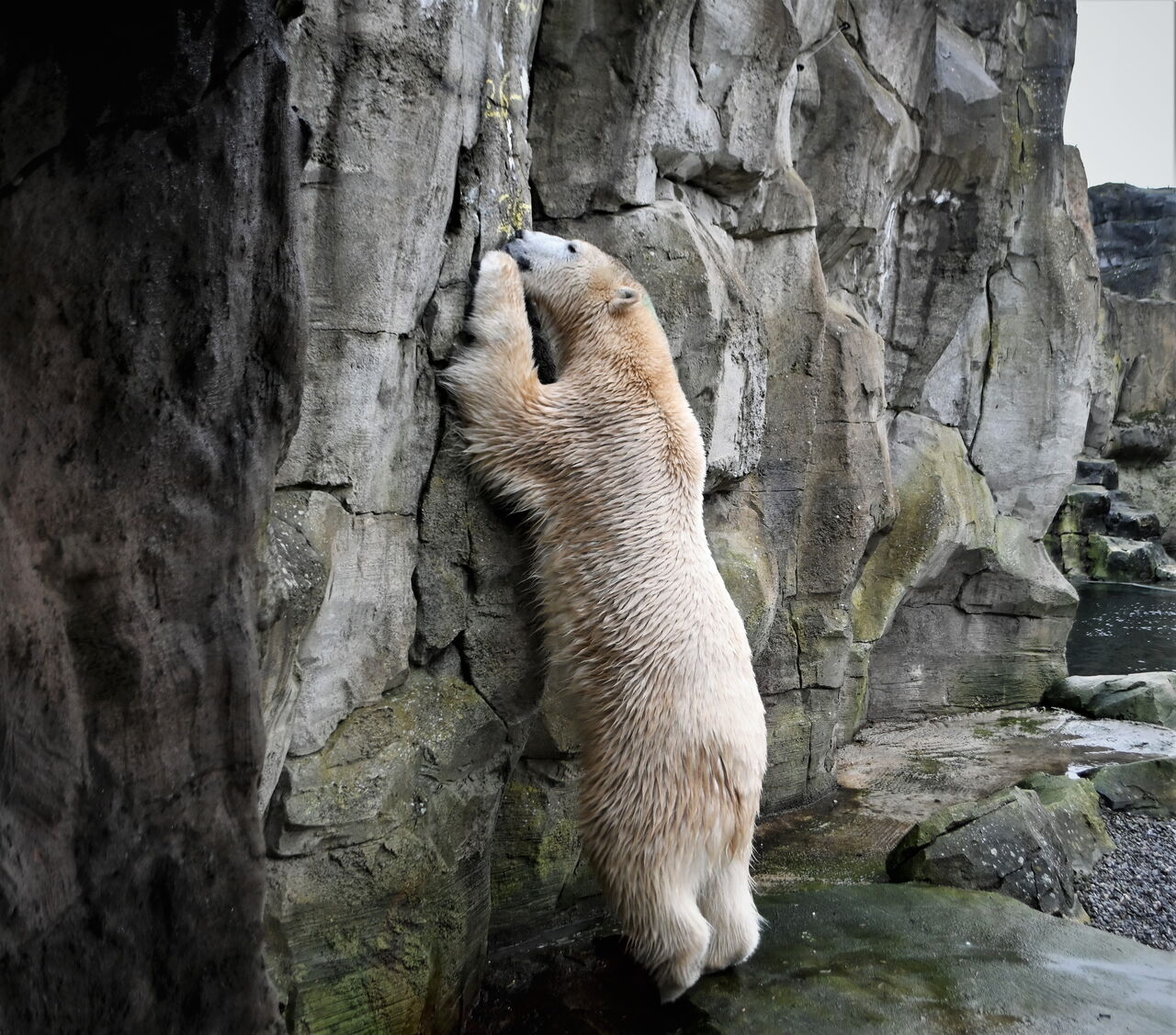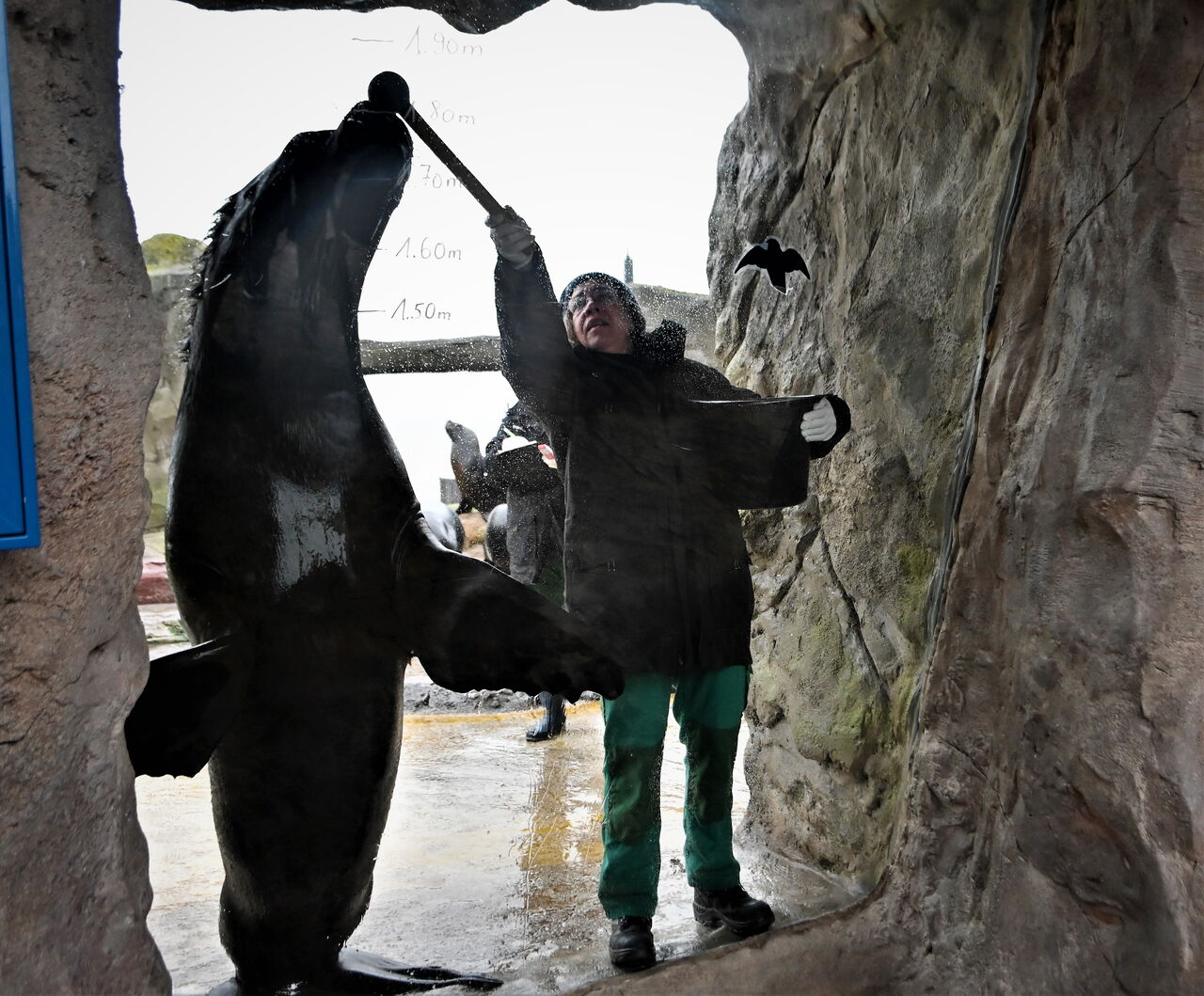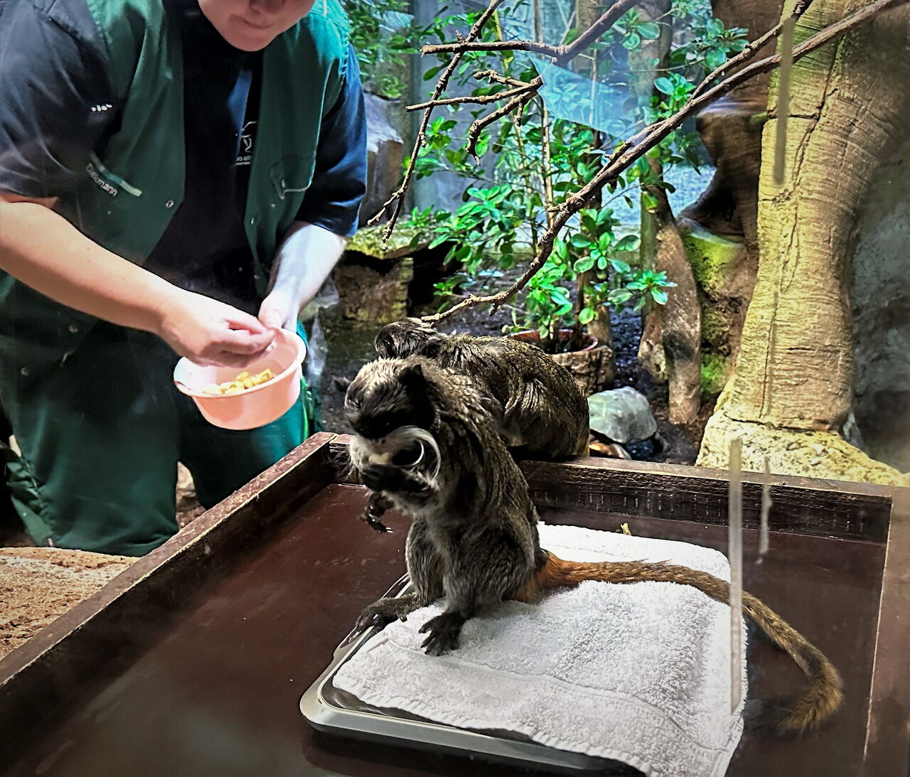 Das Wiegen und Messen der Tiere stellt immer eine besondere Herausforderung für die Pfleger:innen dar, denn die Tiere müssen mitspielen und sich freiwillig auf die Waage stellen oder sich aufrichten. Bei den gefährlichen Wildtieren, wie den Eisbären, geht das nur von außen, mit Training und Leckerlis bzw. bei den Eisbären mit Mayonnaise. Die Seelöwen sind trainiert und arbeiten ohne Distanz mit den Pfleger:innen. Bei den Pinguinen ist Vorsicht geboten, denn sie können kräftig mit dem Schnabel austeilen. Eile und beherztes Zugreifen ist notwendig, um das Tier im Eimer auf die Waage zu setzen. Bei den Kaiserschnurrbarttamarinen spielen nicht alle mit. Sie sind mit Leckerlis am ehesten zum Wiegen zu motivieren. Das Ergebnis ist zufriedenstellend. Die heute vermessenen Tiere sind wohlgenährt und gut im Wachstum.