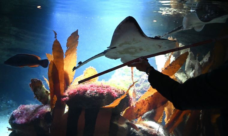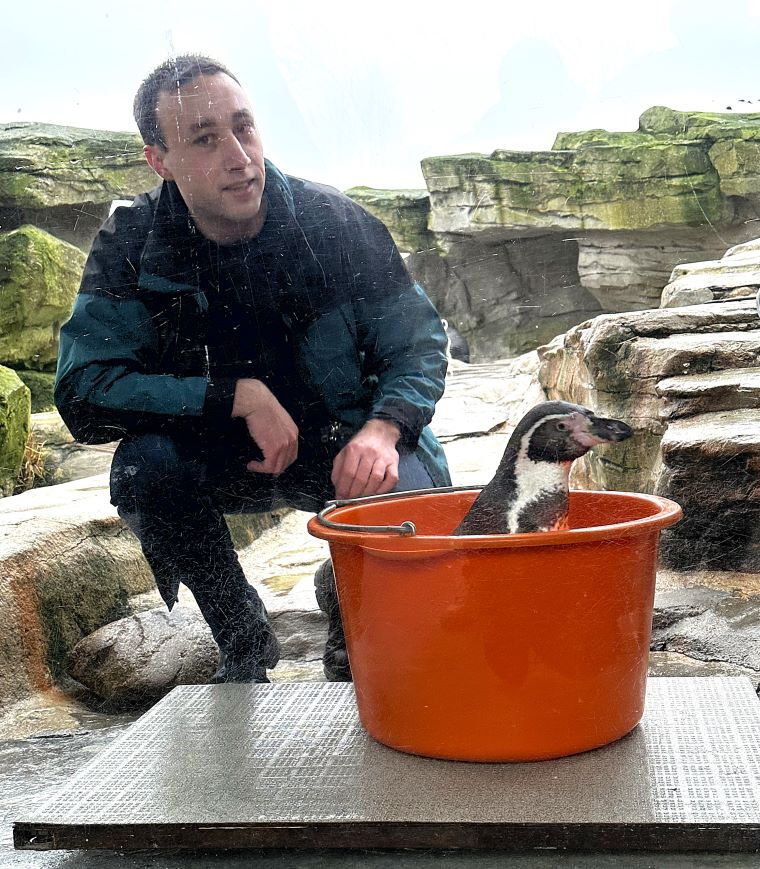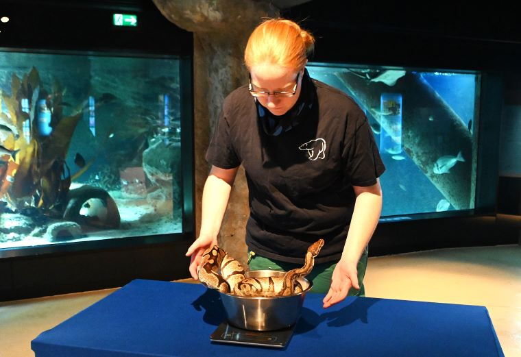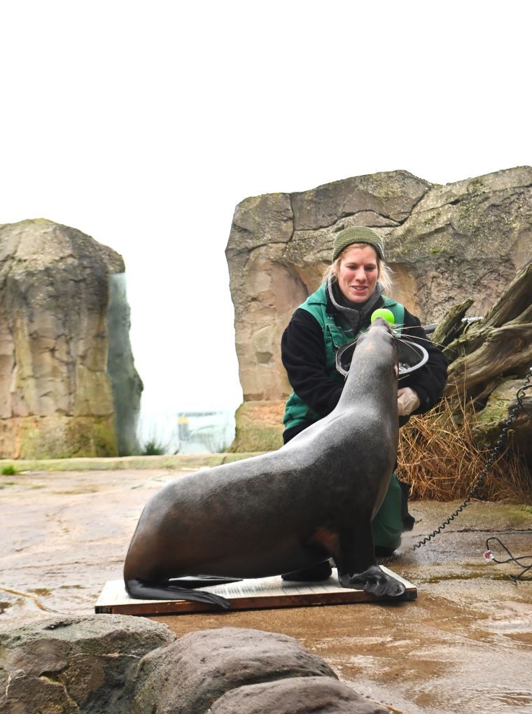 Das Wiegen und Messen der Tiere stellt immer eine besondere Herausforderung für die Pflegenden dar, denn sie sind darauf angewiesen, dass die Tiere sich freiwillig auf die Waage stellen oder sich aufrichten. Bei den besonders gefährlichen Wildtieren, wie den Eisbären, geht das nur von außen, mit Training und Leckerlis bzw. bei den Eisbären mit Mayonnaise. Die Seebären sind trainiert und arbeiten ohne Distanz mit den Pflegenden. Bei den Pinguinen ist Vorsicht geboten, denn sie können kräftig mit dem Schnabel zwicken. Eile und beherztes Zugreifen sind notwendig, um das Tier im Eimer auf die Waage zu setzen. Bei den Kaiserschnurrbarttamarinen ist es mittlerweile Routine und sie setzten sich problemlos auf die Waage. Bei den Nagelrochen musste man heute schnell mit dem Zollstock sein und bei den Königspythen Geduld haben, um das Band zur Längenbestimmung korrekt anhalten zu können. Aber letzten Endes klappte alles und das Ergebnis ist zufriedenstellend. Die heute vermessenen Tiere sind wohlgenährt und gut im Wachstum.