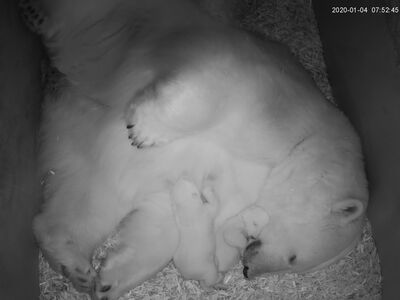 Die am 8. Dezember 2019 geborenen Eisbärenjungtiere entwickelt sich prächtig. Der besonders kritische erste Monat ist überstanden.