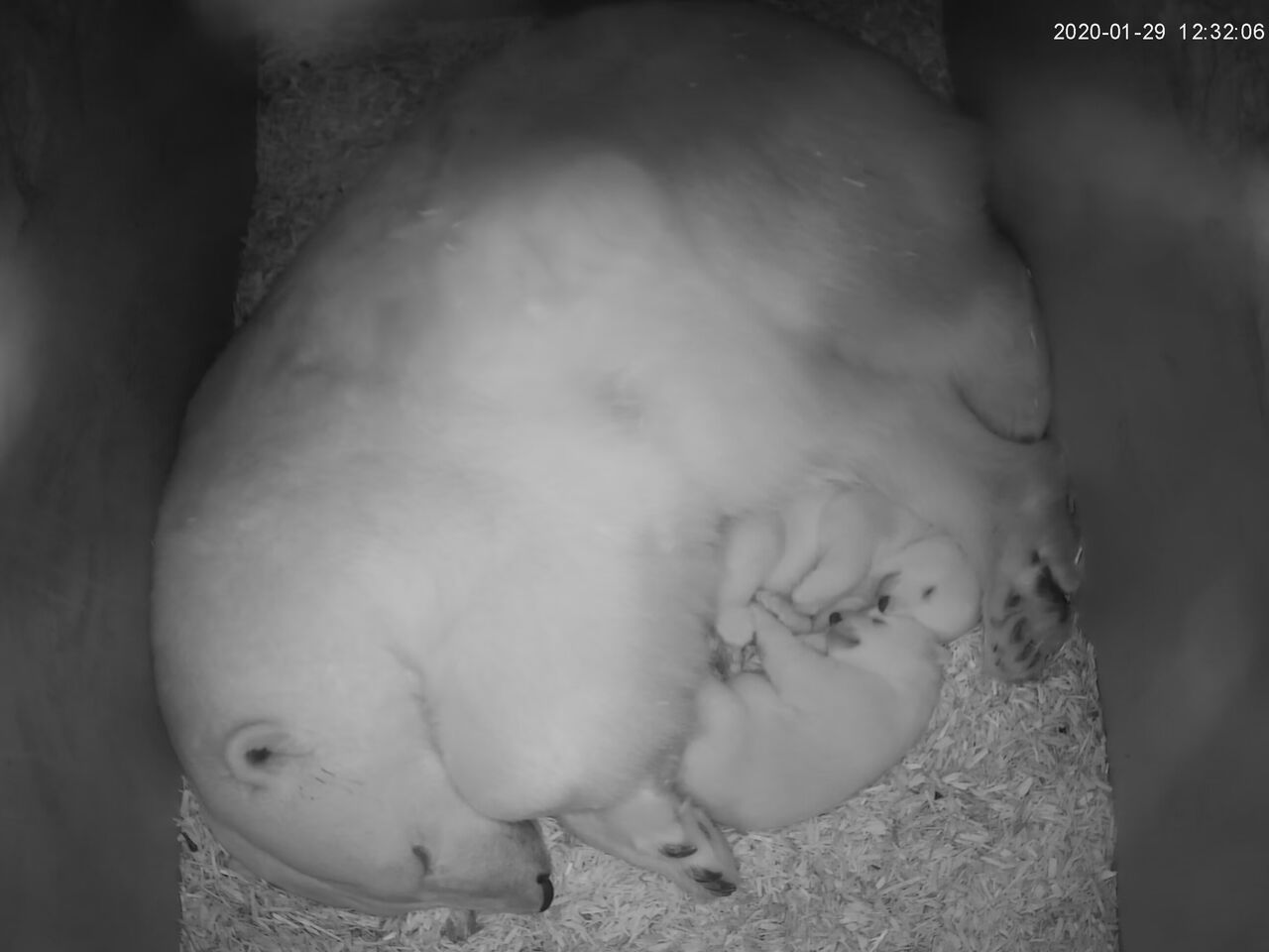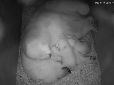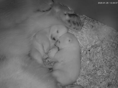 Mittlerweile sind die beiden kleinen Eisbären 54 Tage alt, können hören, riechen und die ersten Milchzähne kommen durch. Deutlich sichtbar ist auch ihre zunehmende Mobilität. Noch stehen sie ziemlich wackelig auf den Beinen. Bis sie sicher laufen können, werden noch ein paar Tage vergehen. Immer häufiger sitzt Valeska beim Säugen, die beiden Jungtiere sitzen währenddessen vor ihr an der Brust. Sie dürften jetzt 3-4 kg wiegen. Die beiden sind immer noch etwas unterschiedlich in der Größe. Ob das mit dem unterschiedlichen Geschlecht zu tun hat, werden wir Anfang März mit der Geschlechtsbestimmung wissen. Jeder Tag ist spannend.