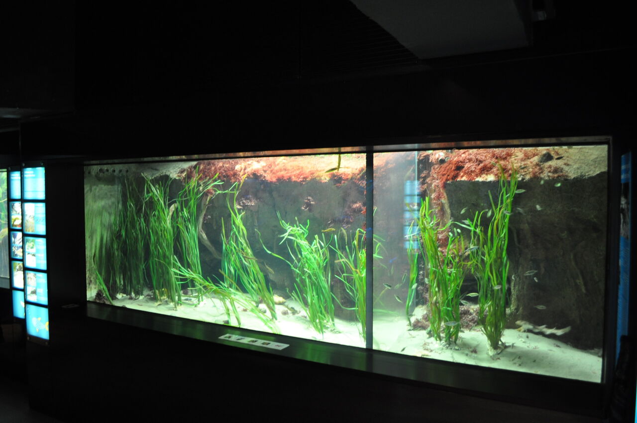 Die zum Teil intensive Beleuchtung über den Aquarium führt zu einem intensiven Wachstum verschiedener Grün- und Rotalgen, die natürliche Biotope bieten. Es stellt sich die Frage, warum gerade in Aquarium 5 zusätzlich noch Kunststoffalgen eingesetzt wurden? Es soll Lebensraum vor Helgoland dargestellt werden, der durch durch diese großen Zucker- und Palmtangarten geprägt ist. Diese Algenarten lassen sich unter künstlichem Licht nur schwer kultivieren.