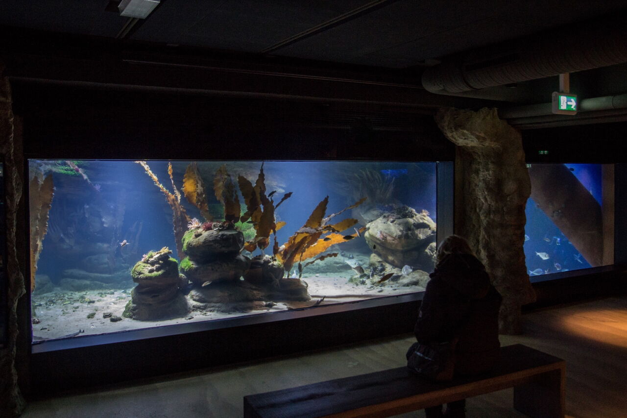 In Aquarium 9 sind große, kälteliebende Fischarten, wie der gestreifte Seewolf (Anarhichas lupus), Wittlinge (Merlangius merlangus) und Seehasen (Cyclopterus lumpus) zuhause.