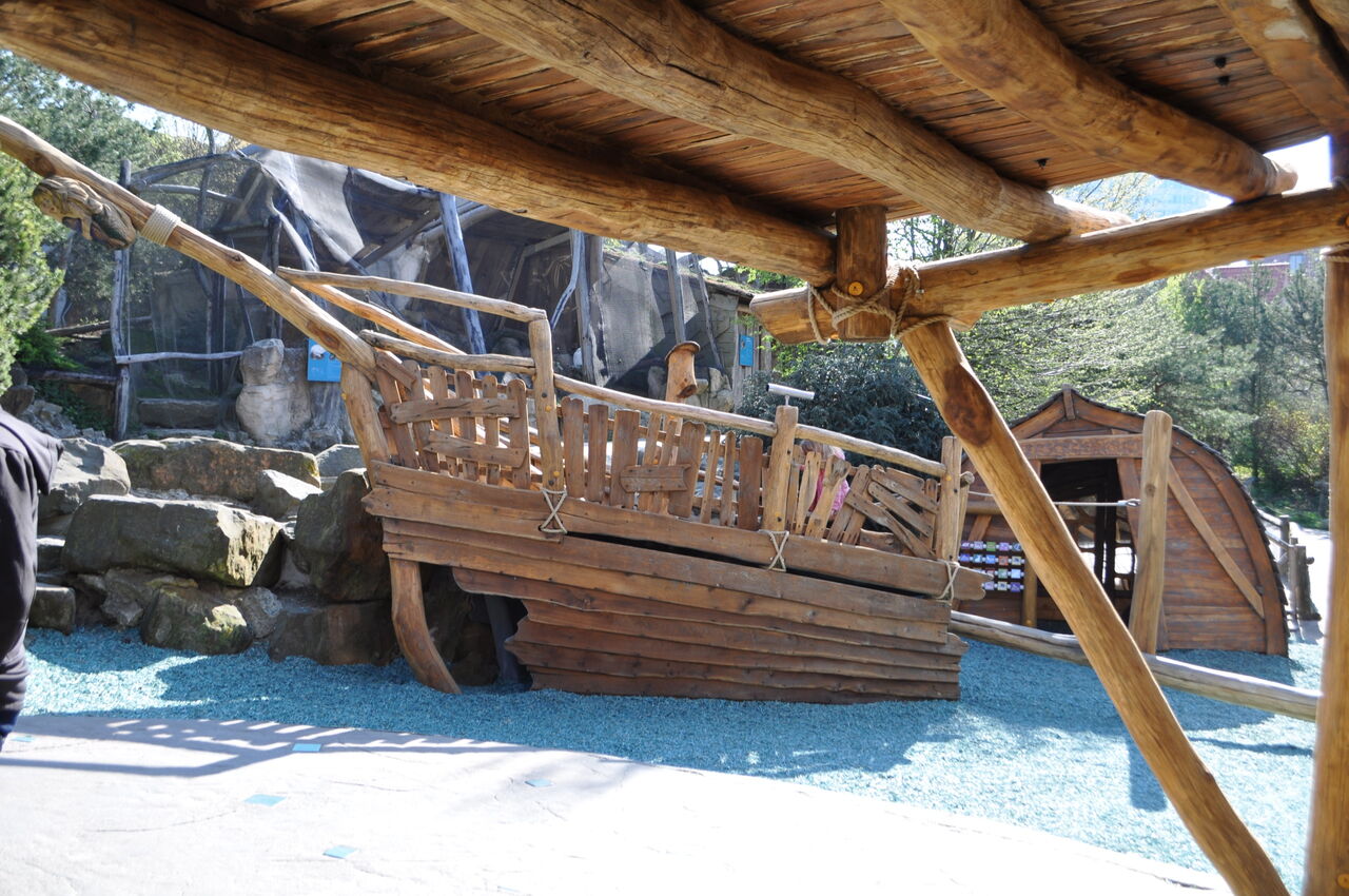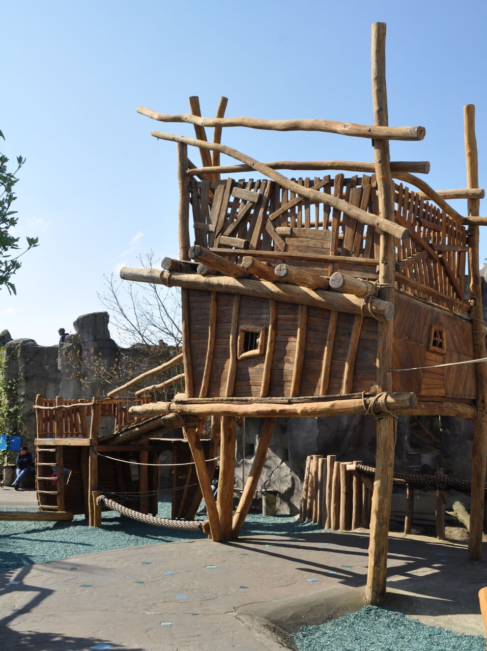Der 1928 eröffnete Zoo am Meer in Bremerhaven wurde in den Jahren 2001 bis 2004 komplett an selber Stelle neu gebaut. Aufgrund der sehr kleinen Nutzfläche von 1,2 ha konnte ein Neubau erfolgen. Trotz der geringen Größe wurde von Beginn an ein Spielplatz eingeplant, da Kinder nach einem Zoorundgang noch die Möglichkeit haben sollten, sich auszutoben, während die Eltern auf der Terrasse ein Stück Kuchen genießen. Der Schwerpunkt des Zoos mit wasserbezogenen und nordischen Tieren, wurde bei der Gestaltung des Spielplatzes aufgegriffen. Es wird ein gestrandetes Schiff dargestellt, dessen umgekippter Bug als Stall für die Kaninchen genutzt wird. Aus Platzmangel ist das Führerhaus des Schiffes auf Stelzen gebaut worden, unter dem der Besucherweg weiter verläuft. Von der erhöhten Plattform des Führerhauses führt eine Hängebrücke zum Gehege der Keas und erlaubt einen besonderen Einblick. Die Höhenunterschiede im Zoo wurden für einen Kletterweg mit anschließender Rutsche genutzt. Auch ältere Kinder nutzen den Spielplatz gerne zum Klettern und Balancieren.