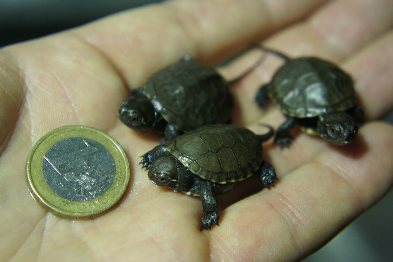 • Neu geborene Sumpfschildkröten im Vergleich zu einem 1,-Euro-Stück