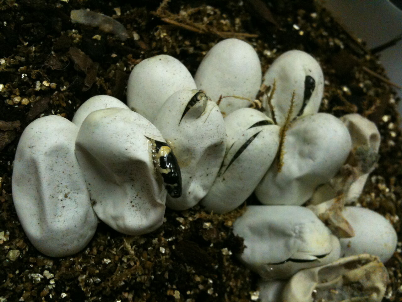 im Frühjahr nach der Winterruhe paaren sich die Tiere, bis zu 50 längliche Eier werden in verrottetes Pflanzenmaterial gelegt, Schlupf nach 6 bis 8 Wochen