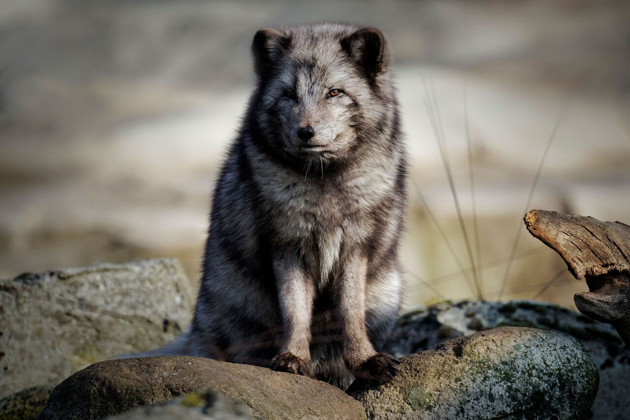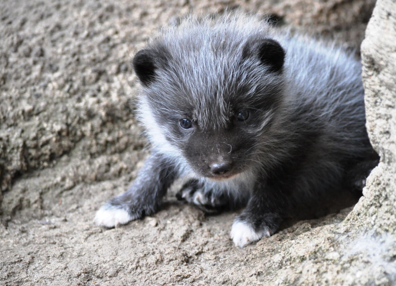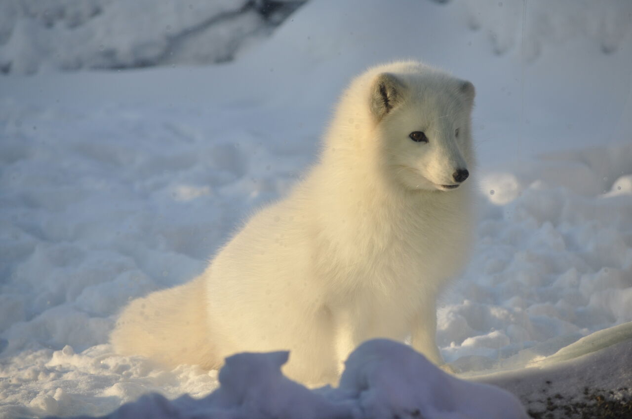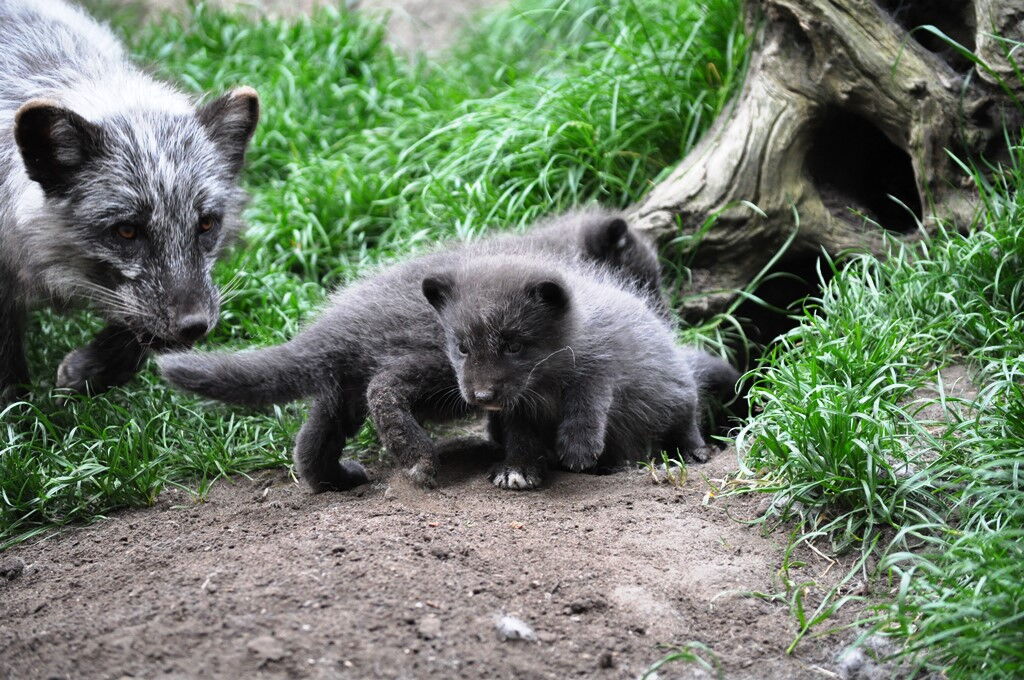 • Zwei kleine Polarfüchse erkunden mit ihrer Mutter die Anlage