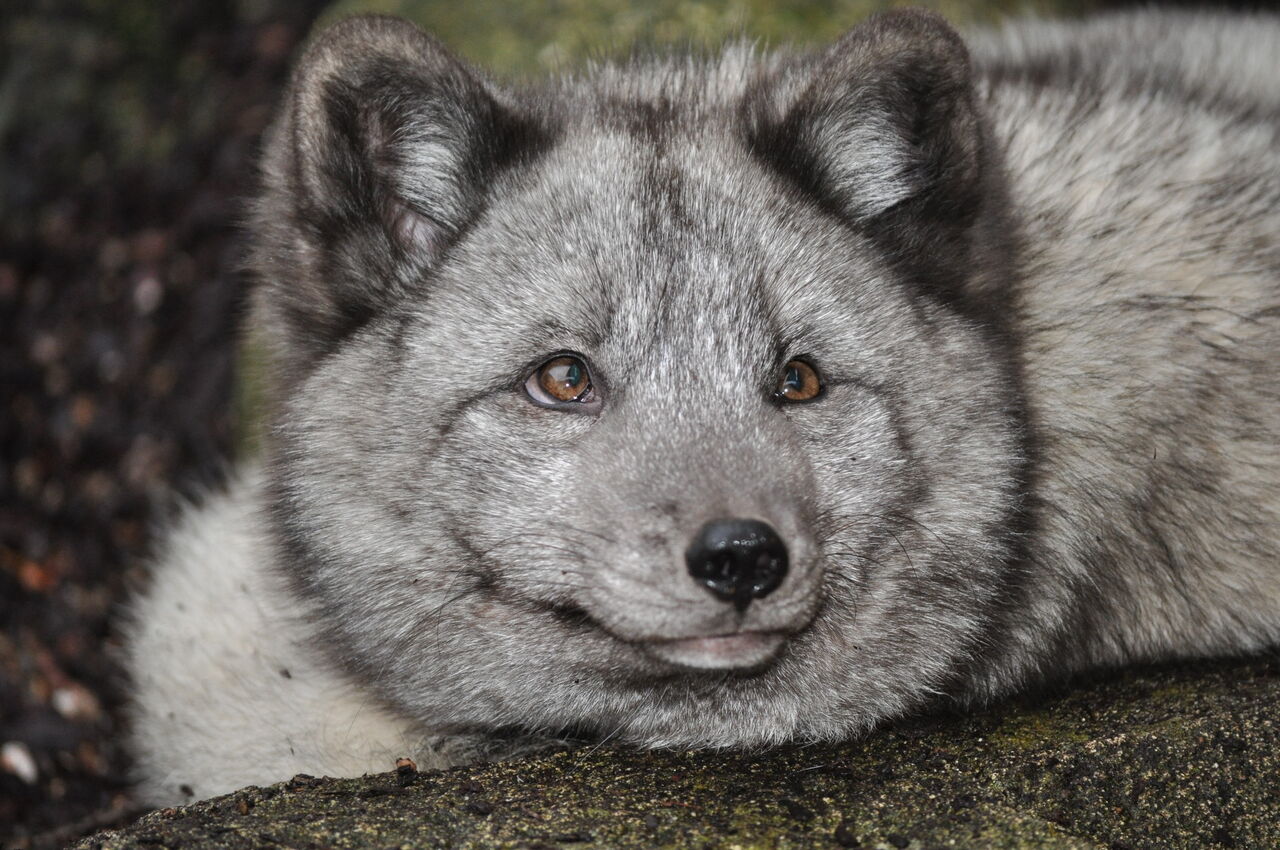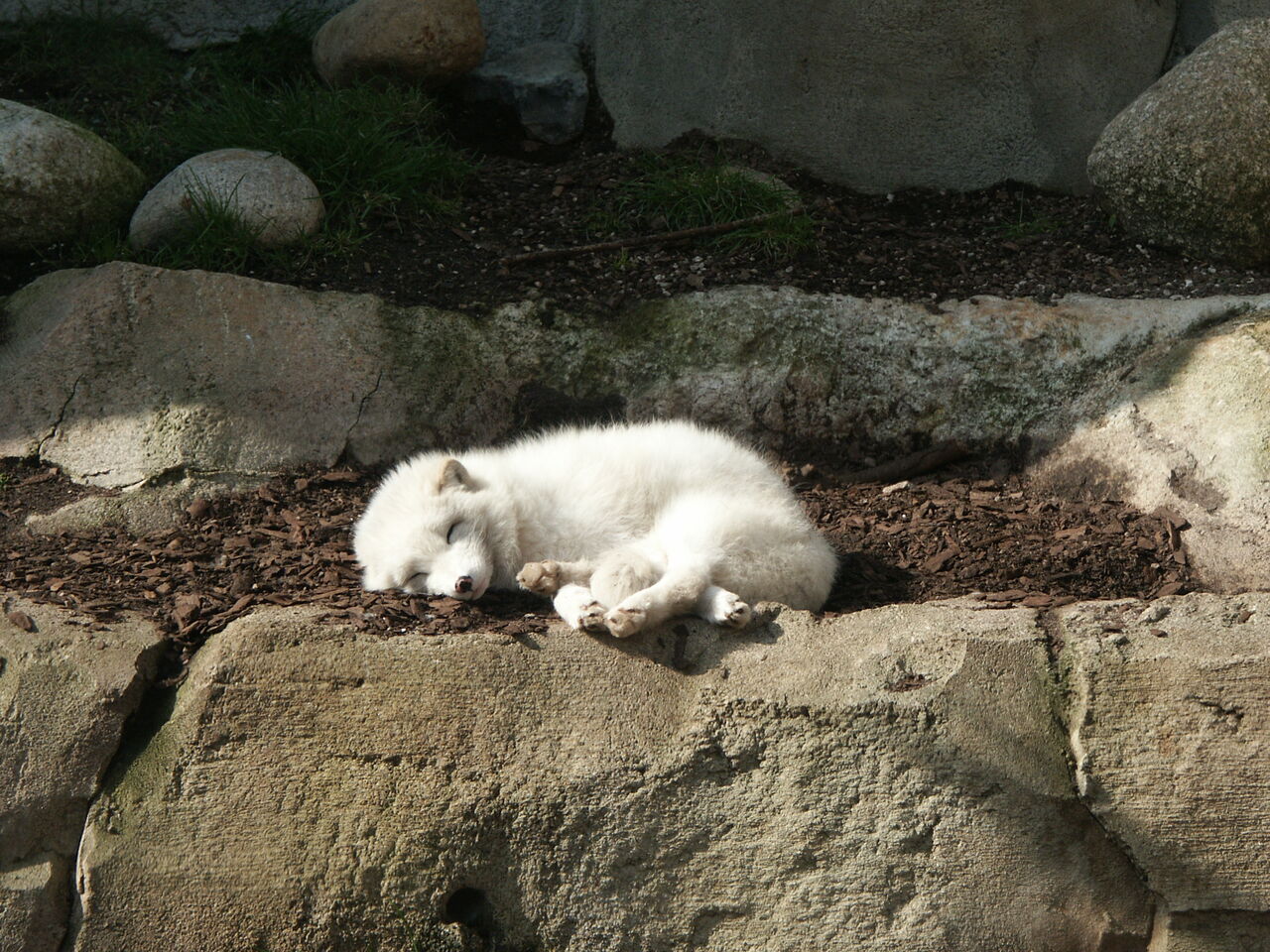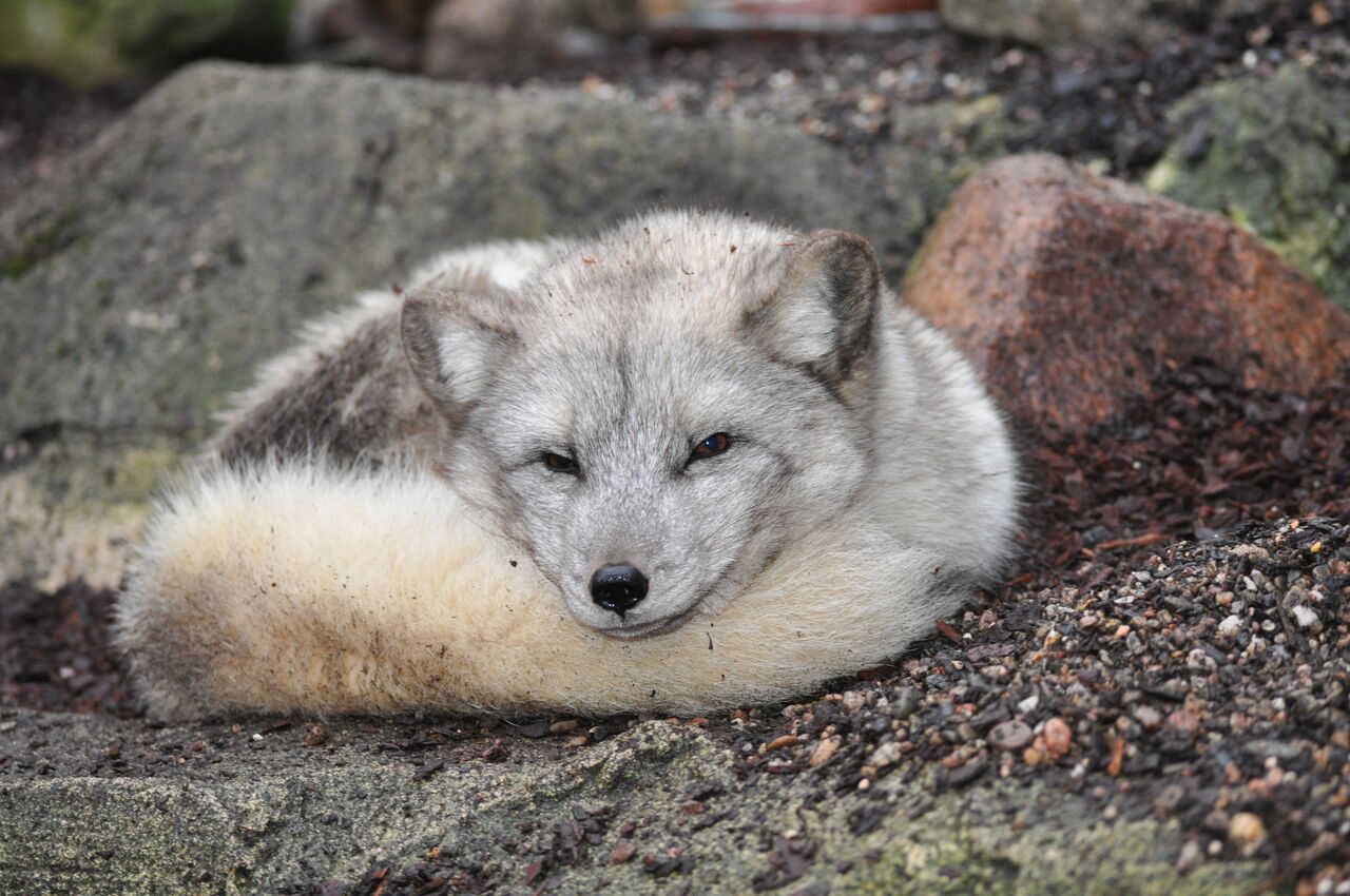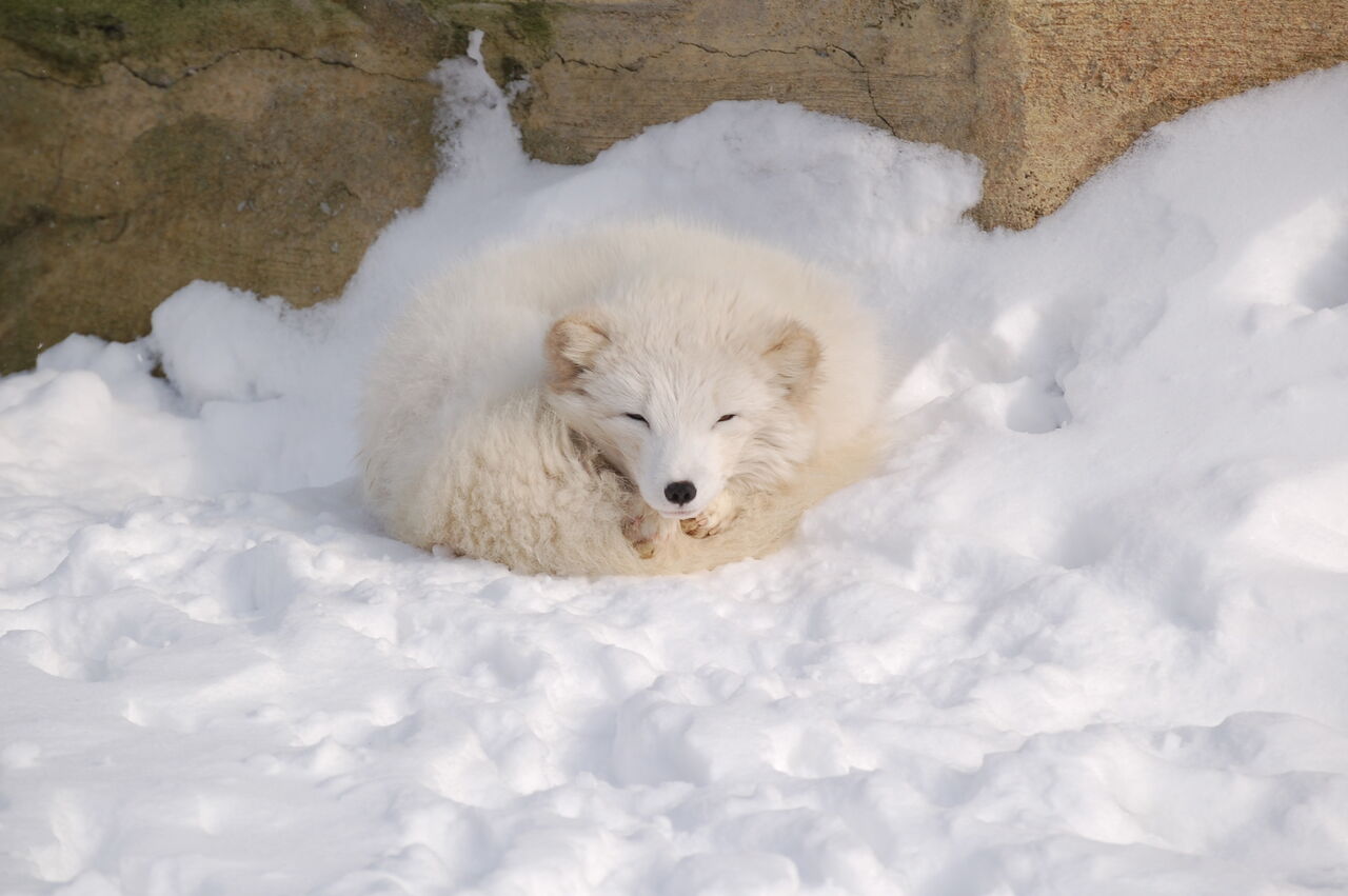• Polarfuchs zusammen gekuschelt in seinem Gehege