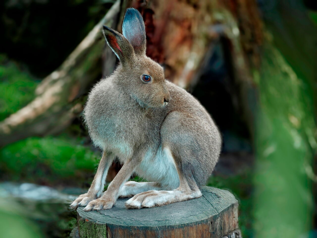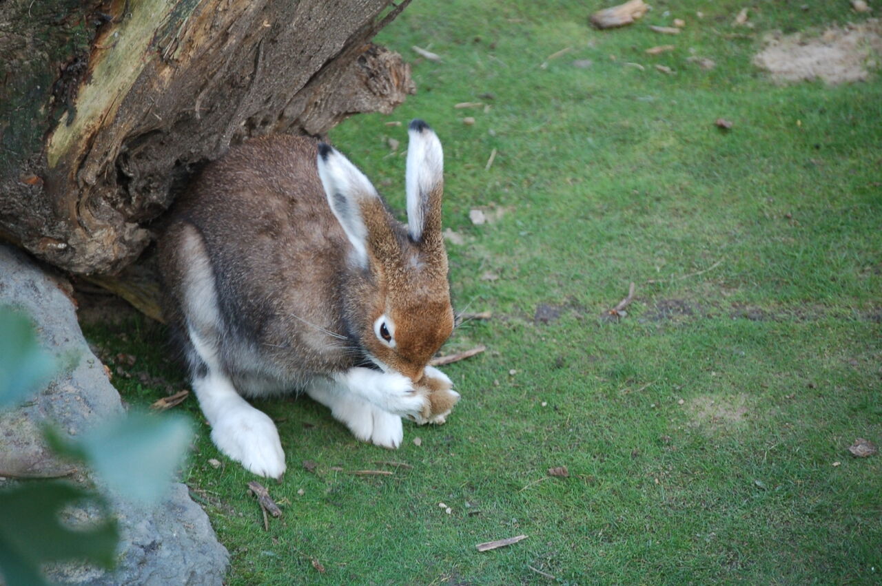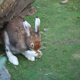 • Schneehase auf einem Baumstamm im Gehege