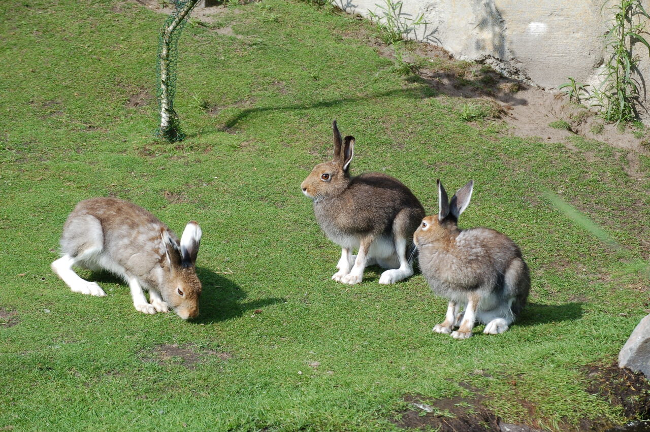 • Drei Schneehasen auf der grünen Anlage