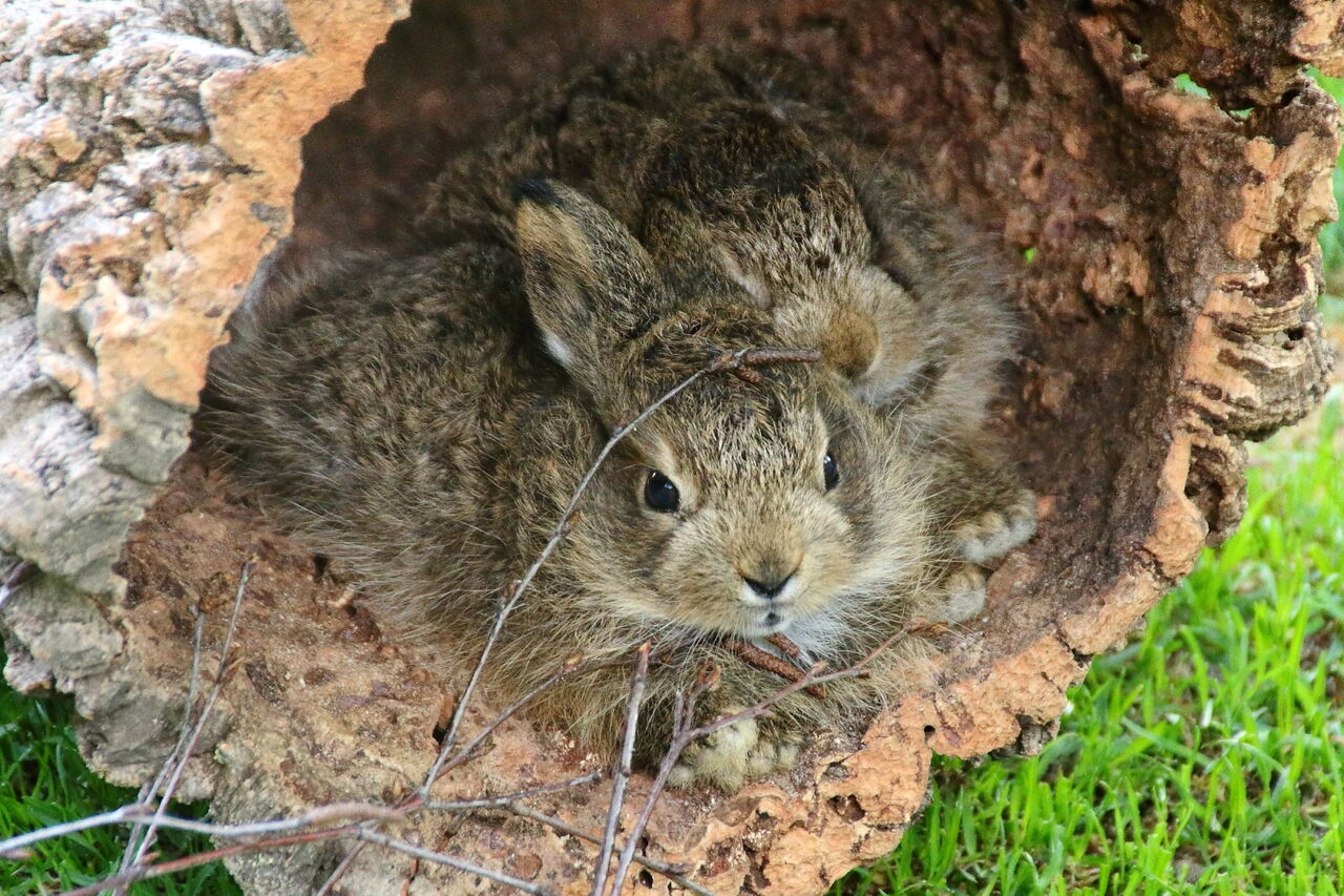 • Nachwuchs bei den Schneehasen: Zwei kleine Schneehasen schützen sich in einem ausgehöltem Baumstamm
