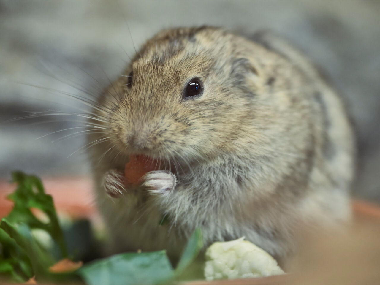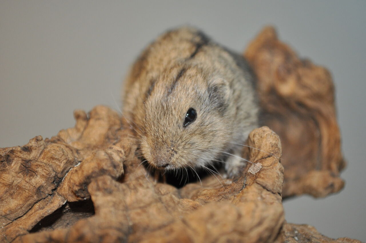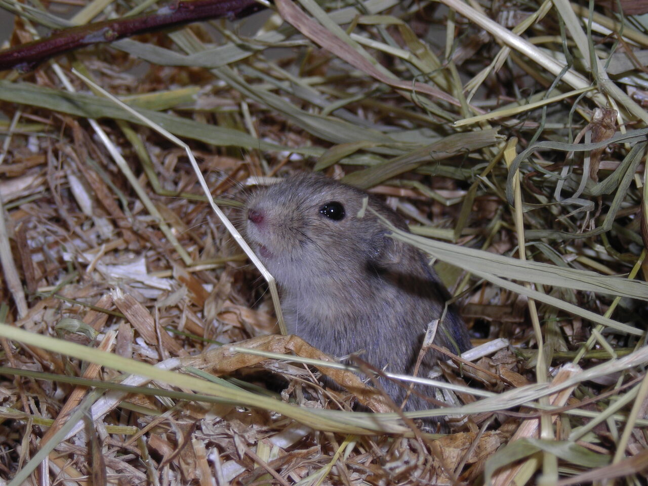 • Ein kleiner Steppenlemming schaut aus dem Heu