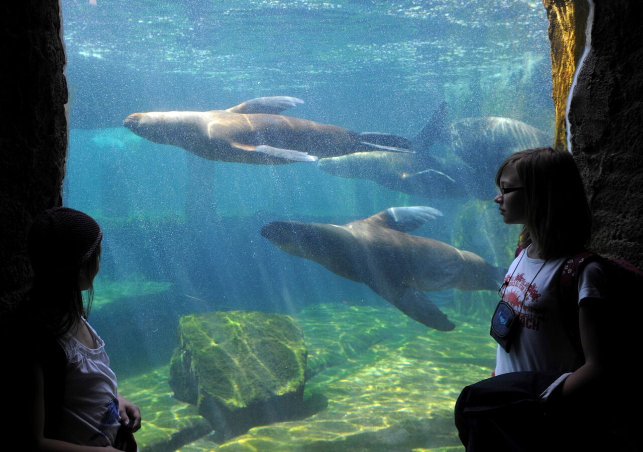 • Kinder beobachten die Seelöwen unter Wasser