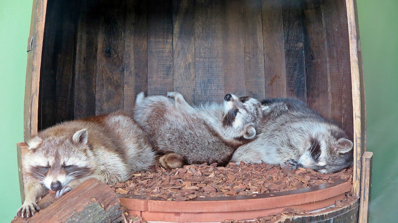 • Drei Waschbären schlafen in einer alten Holztonne