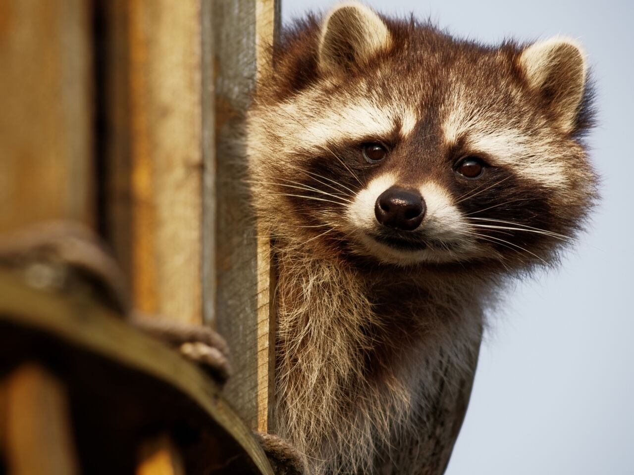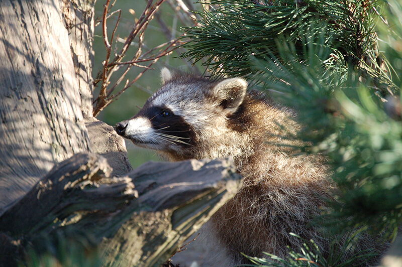 • Ein Waschbär schaut um die Ecke