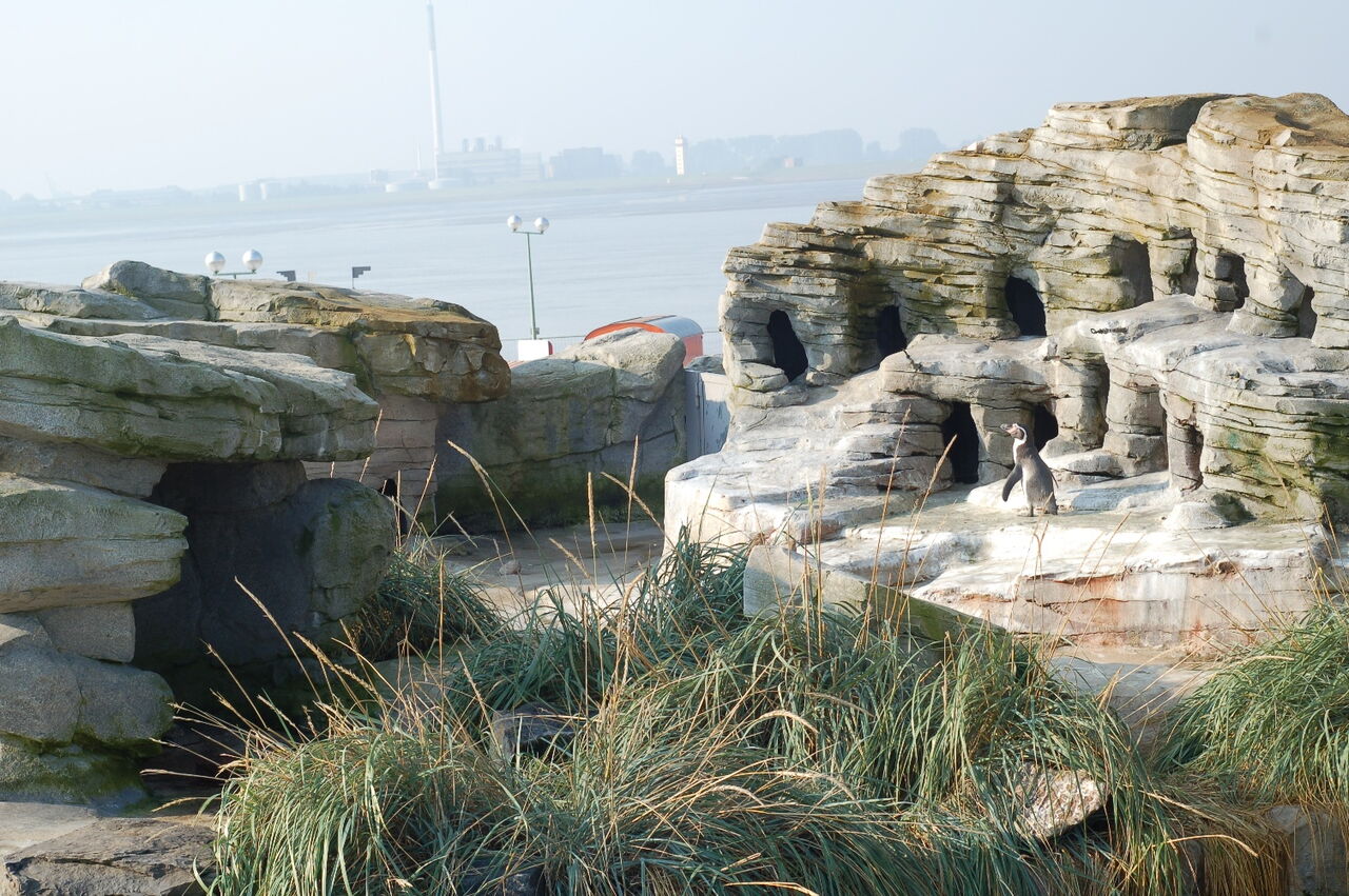 • Einsicht in das Gehege der Humboldt-Pinguine mit Blick auf die Weser
