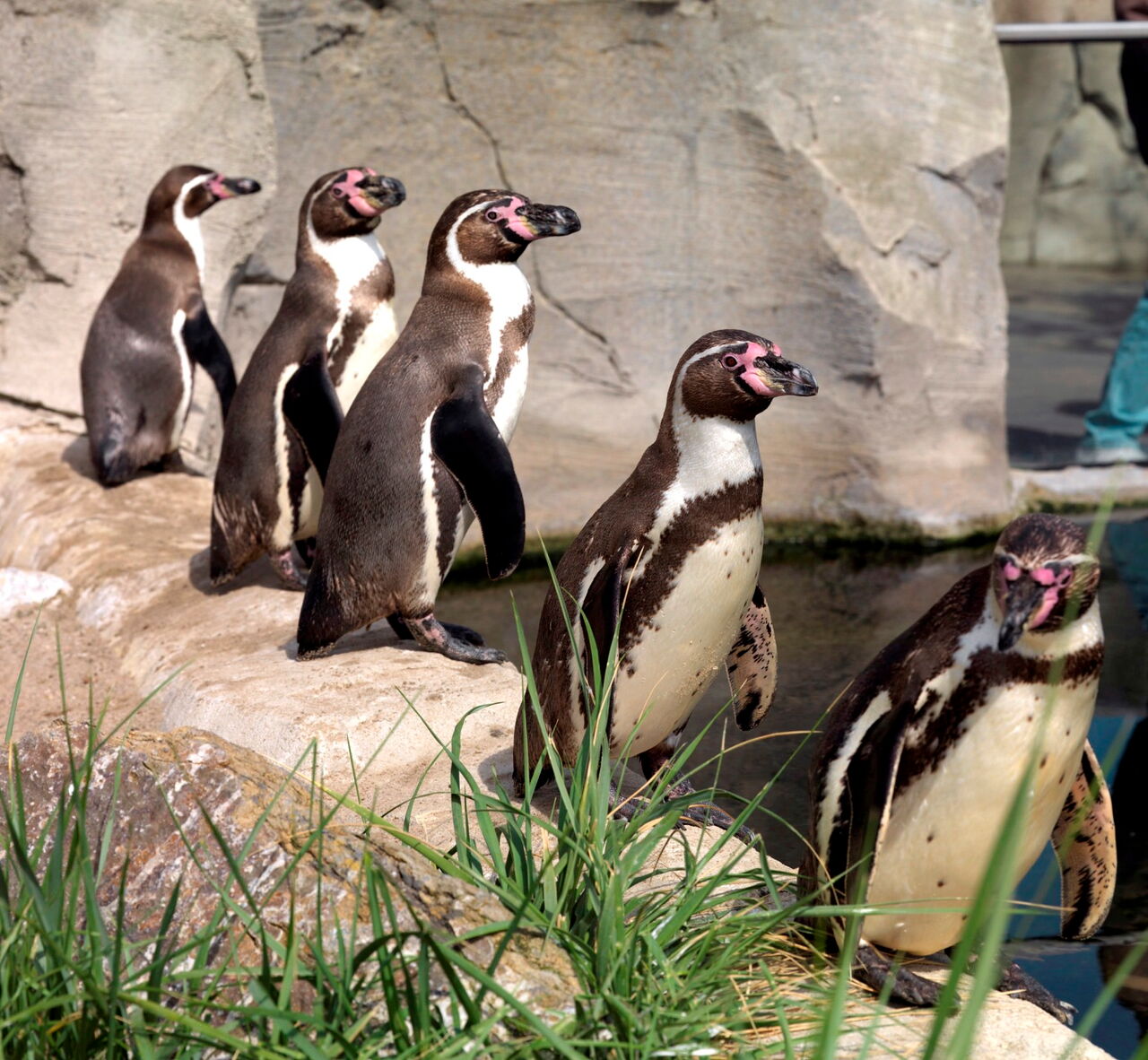 • Eine Gruppe der Humboldt-Pinguine sitzt auf einem Felsen im Gehege