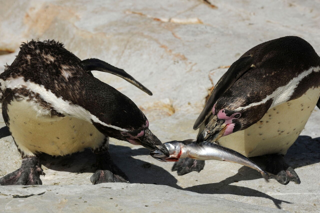 • Zwei Pinguine streiten sich beim Fressen um einen Fisch